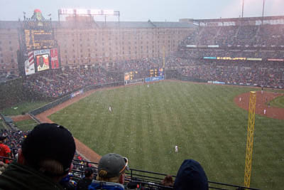 Last night we went to our first Orioles' game where we got to sit in the seats we had purchased under our 13 game season ticket plan (we also went to opening day on March 31, but we were in the upper deck thenthe holder of the 29 game plan for our seats gets them on opening day). We also got to park in the season ticket holders lot for the first time, which is located next to the Ravens stadium, is cheaper than any of the regular downtown lots, and which has a much less congested way to get out to the interstate after the game is over. It was warm during the day, but by the time the sun went down and the wind starting blowing in across the harbor, my short sleeves weren't really enough. Even Julie, who had a light coat on, was pretty coldbut it still wasn't nearly as bad as Monday night, when it snowed during the game (and that was a day game, too).