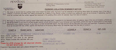 Rather than risk further late fees, court costs, etc., I decided to send in the fine, along with a letter of protest, but I have no expectation that Penn State will do anything except throw my letter in the trash and cash my check (the instructions on the violation notice say that any appeal must be accompanied by a check in order for the appeal to be considered). It's not that much money, but it's still really irritating to have to pay this.