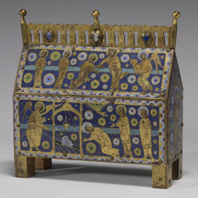 It's an enameled reliquary that was designed to hold the relics of St. Martial, who was a 3rd century bishop from Limoges famous for being able to resurrect the dead. There's a nice confluence of circumstances here: Limoges is the area most famous for producing intricate enamled pieces, and it was also a major stop on the southern pilgrimage trail on the way to the church in Spain that holds the remains of St. James. So St. Martial was a major local hero, and the reliquary that holds his relics is a fine example of the artistic technique that the region was famous for.